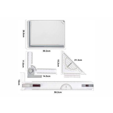 Description Comes with 2 parallel rulers and 2 corner clips. Approx. Size: 51 x 37 cm/20 x 14.6” LxW . Drafting head-lock mechanism for straightedge and free-swing setting. Set square is marked with a protractor. Made of premium high-impact Acrylic. Quick release paper clamp on both edges to secure it all around. It makes the…