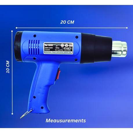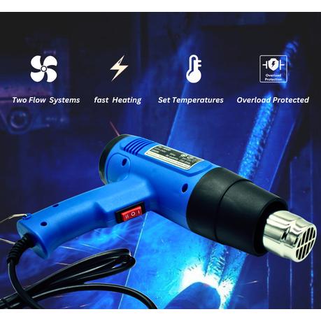 The ultimate Hot Air Gun built to perfectly execute both your DIY and professional projects. This superior tool features a user friendly design, it is robust, very handy and comfortable to handle with precise control. It features an adjustable switch that allows you to adjust temperature settings and airflow rates, it provides flexibility to tackle various tasks, and it embeds a powerful heating element that ensures fast and uniform heating, while its optimized airflow design enhances efficiency and performance.