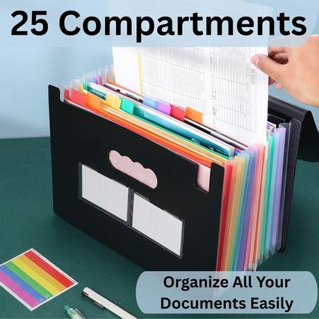 - 25 Easy-to-Access Sections: Equipped with 25 individual compartments, this folder allows clear and quick separation of documents. Each section expands to accommodate both thin and bulky papers, helping reduce clutter while improving organization.